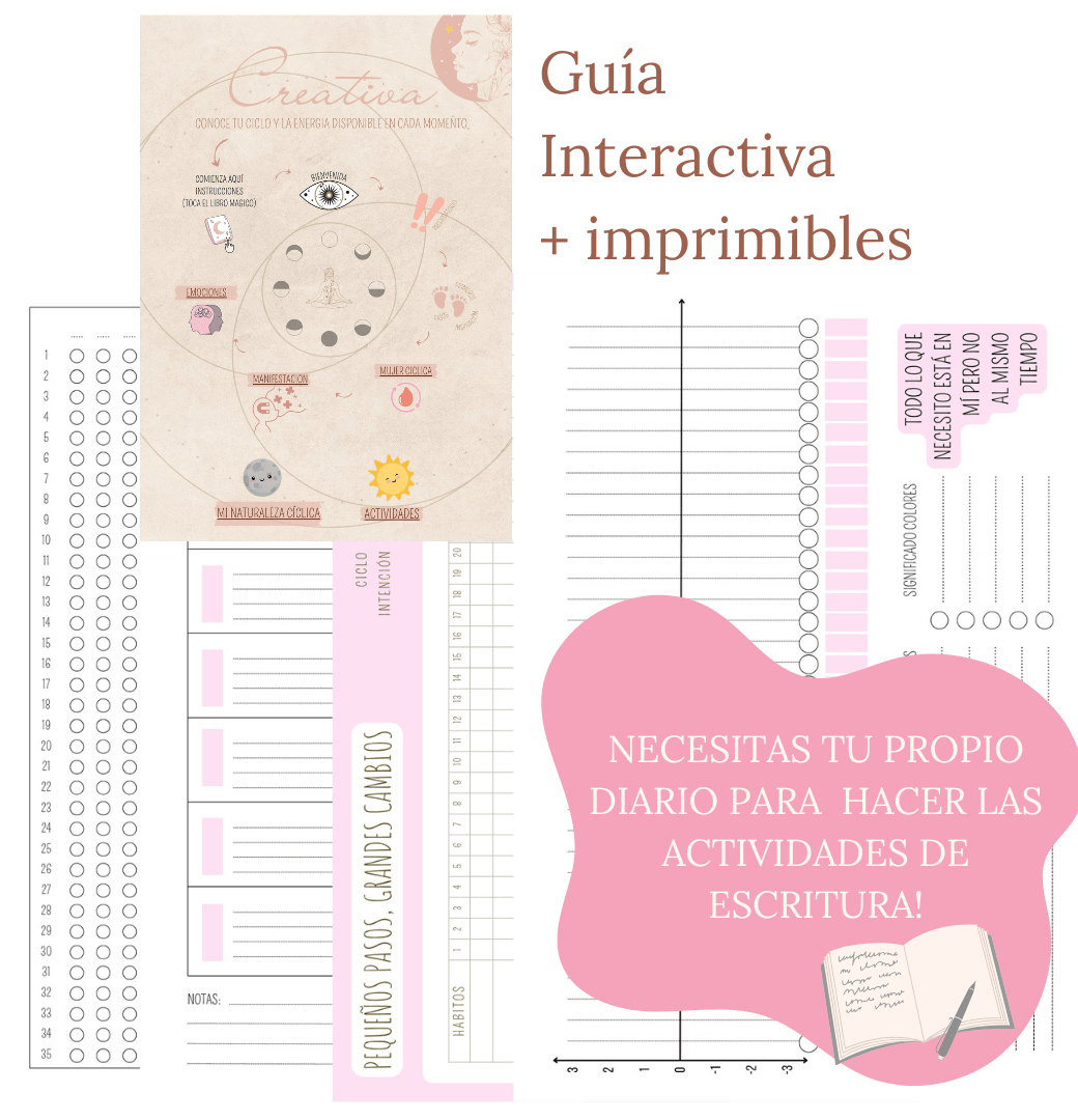 La Guía te lleva a explorar tu ciclo completo, las 4 fases, desde diferentes enfoques. Pero tu información real, la tuya personal, TU PROPIO RITMO, llegará si realizas las actividades propuestas y los registros correspondientes. Para explorar tus patrones tienes que explorarte a ti a lo largo del tiempo. La Guía te muestra el camino, porque cada persona tiene su propia naturaleza única.